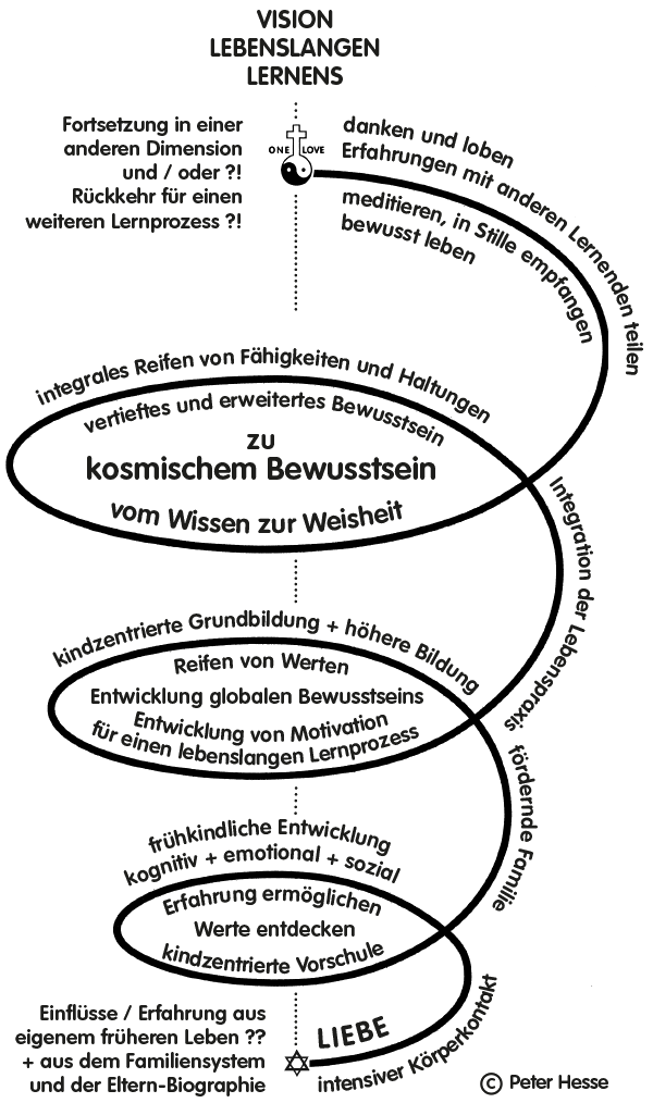 Da Leben mehrdimensional ist, war dies nicht klar genug und führte schließlich zu meiner Vision lebenslangen Lernens – oder genauer: zur Spirale frühzeitig geförderten, lebenslangen Lernens für ganzheitliches Wachstum jedes einzelnen Menschen.